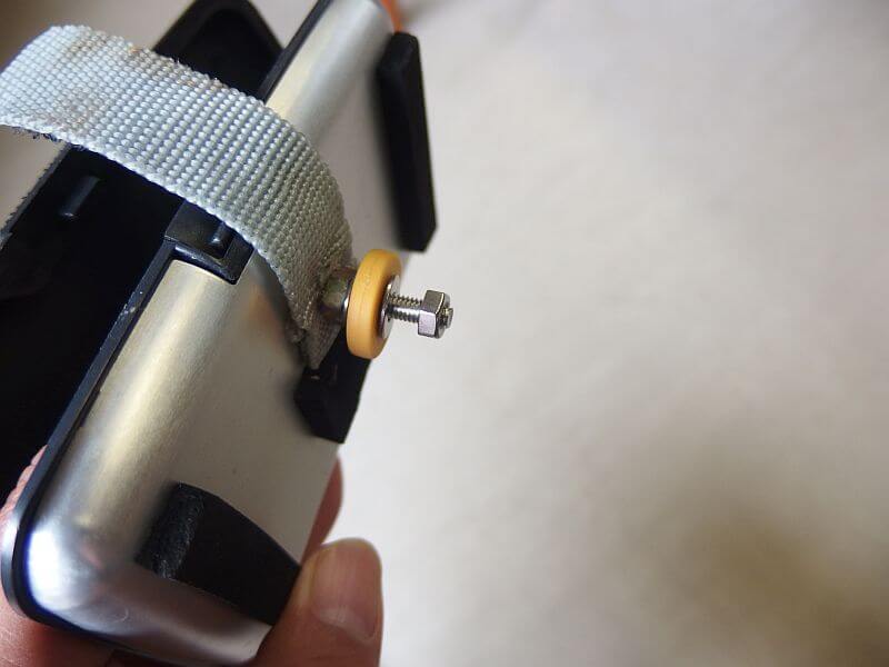 帯は耐水性がありそうな手近なものでいいと思います。私は使えそうな素材は捨てずにとっておく習性がありますので、シルバーに色合いの似た物が在庫にありました。ケースには粘着テープで貼り付けて、帯は化繊布なので密着性に不安がありましたので、手持ちの太めのナイロン糸で少しばかり縫い付けておきました。