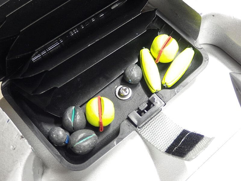 収納部にはあまり出番がないのに身に着けていると重い、大きめのオモリを多めに入れました。身に付けていたオモリの重量が減った分、身軽に動き回ることが出来ました。今後は機動力が高まりそうです。欠点を強いて言えば、収納部が引船のおしりの下流側にかなり偏って付いていますので、大きいオモリをぎっしり詰め込みすぎると引船のおしりの方が少し沈み込むような感じがあります。本来の設計では見込まれていない収納部を、強引に後付したものですのでこれは仕方ありません。