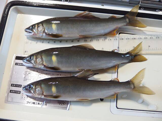 それから30分後に交通事故的にオトリにならないサイズのおチビちゃんを一匹追加。釣ったオトリよりちょっと小さい16センチ級とオトリ2匹をローテーションして辛抱強く探っていくもその後の釣果はゼロ。「今日はもうだめっぽいな」と15:40ぐらいになって足取り重く帰路につきます。