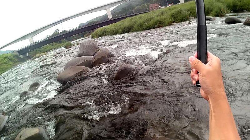 しばらくするとやっとおチビちゃんを蹴散らす大人げないオラオラ系のヤンキー鮎がヒット。おチビちゃんスパイラルをやっと脱します。この辺りには居ることが分かったので粘らずにポイント探索モードに切り替えて、上流に遡りながら釣り上がって行きます。今後の釣行のためにもポイントをひと通り見ておきたいですからね。混んでると自由に動けませんから、空いているときこそ動き回って探索する絶好機です。