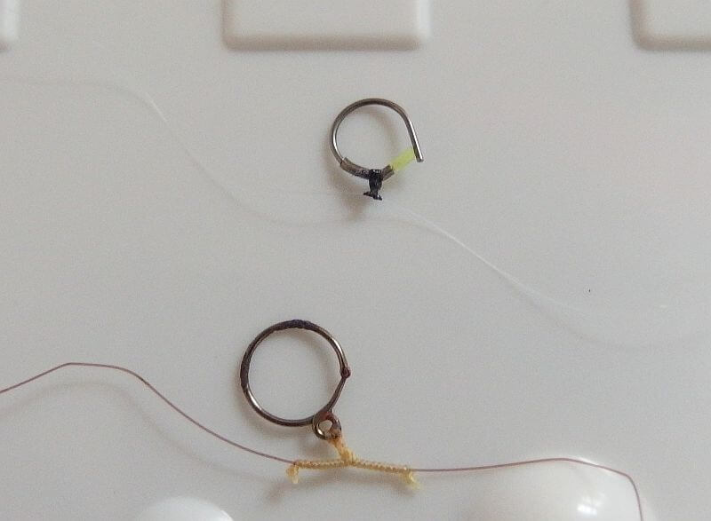 上が今季当初より使っている、自作のフロロ0.4号のプールジック結び遊動鼻カン周り