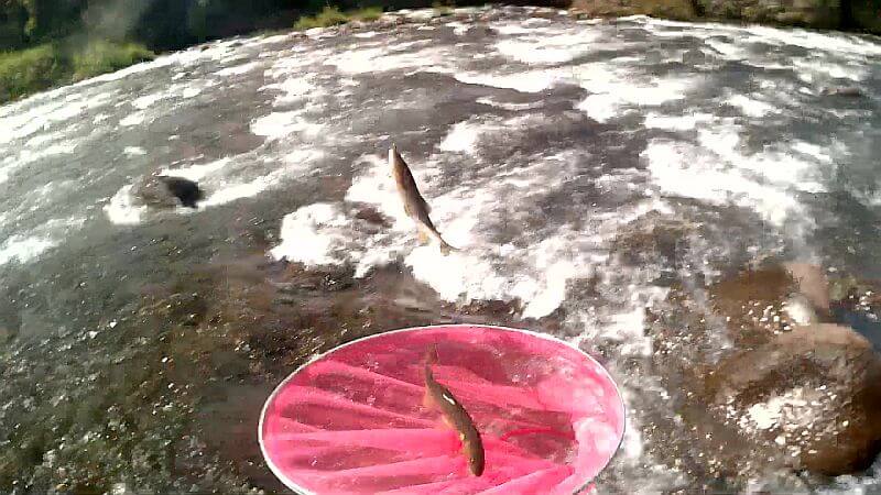 しばらくするとガツーンとアタリがあり、下に走られます。流れの緩い瀬脇に寄せようとした途端、無念のバラシ。感触からすると掛かりが浅くて身切れをしたようです。気を取り直して再開するとまたすぐに追いが。それから30分で4-5匹がタモに収まりました。いずれも良型で強い瀬を走り回るので、竿をのされないように数メートル下ったりと取り込みも必死です。